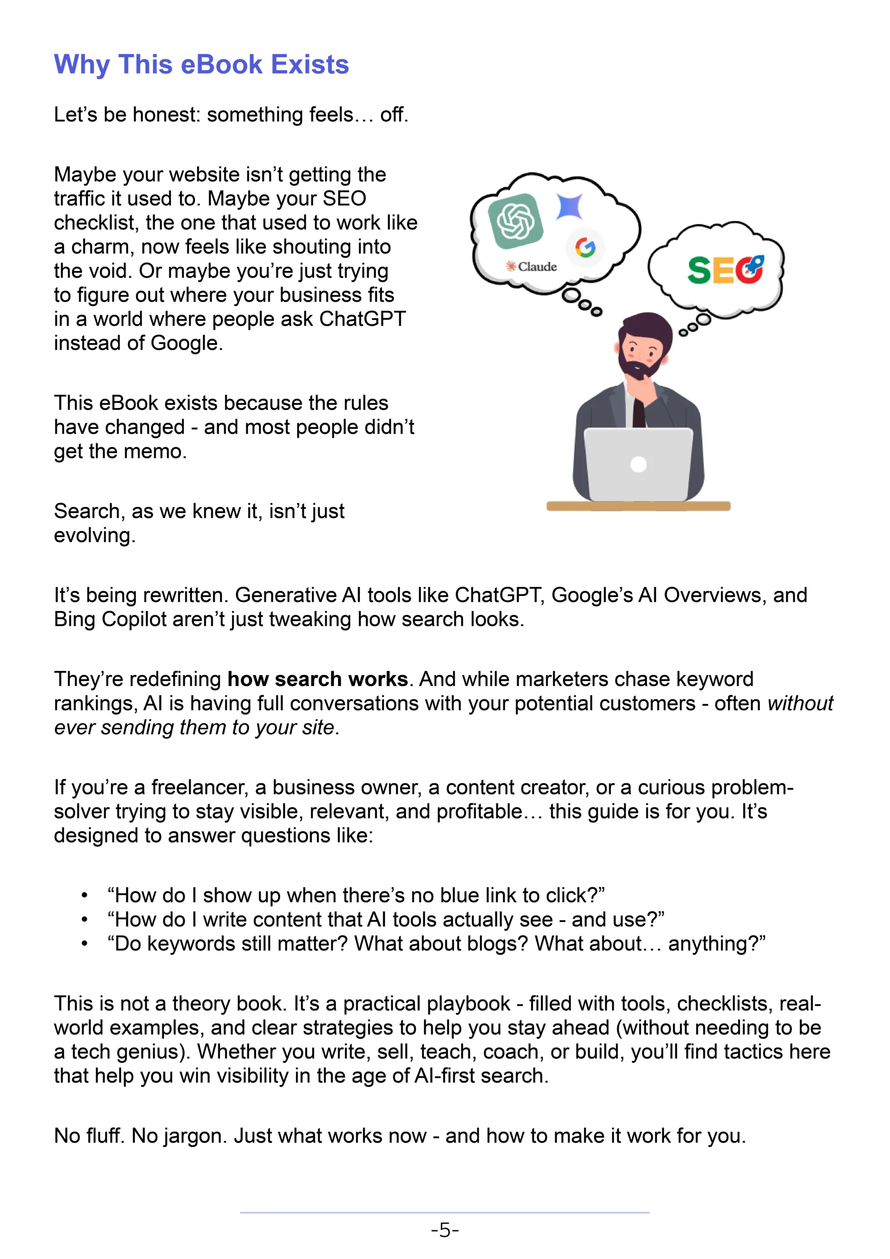 Smarter SEO with AI is not just an SEO guide — it’s your strategic weapon for navigating the massive shift from traditional Google rankings to AI-first search engines, like ChatGPT, Bing Copilot, and Google’s AI Overviews. Whether you’re running a small business website, launching digital products, or trying to increase organic traffic without hiring an agency, this guide shows you how to win visibility with AI-powered SEO tactics that actually work today. Ever wondered how does search engine works in the age of AI? This guide doesn’t just explain it — it shows you how to win in it.